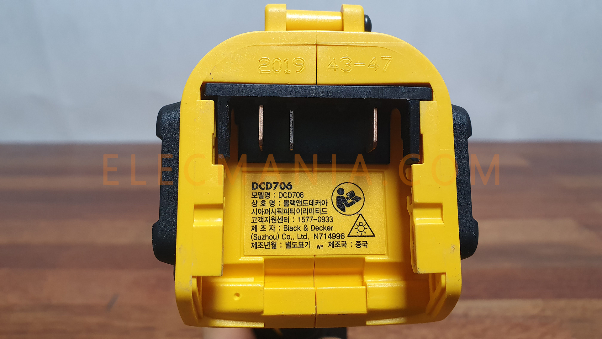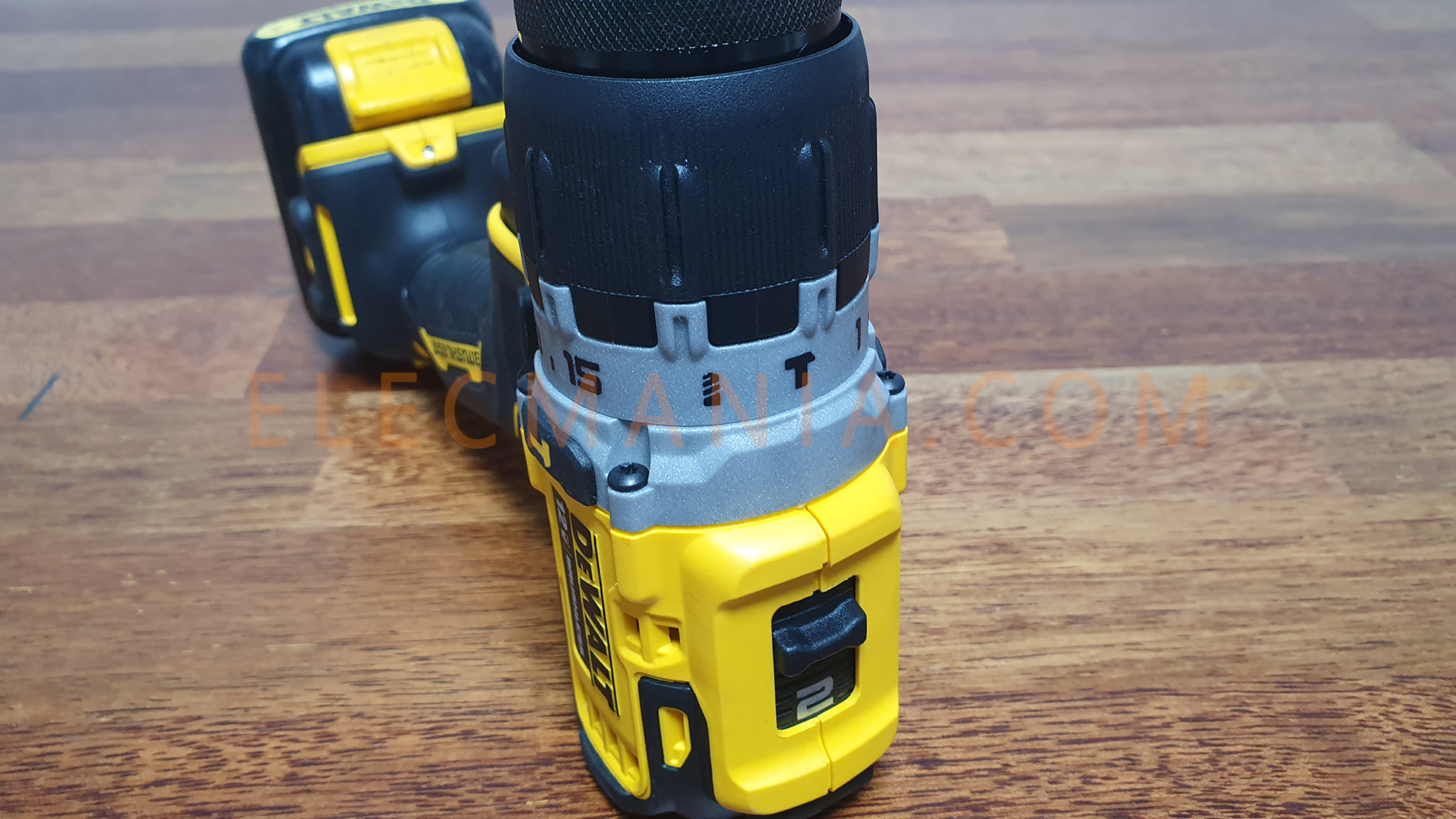 DCD706 상단에는 2단계 속도 조절 레버가 있으며 15단계로 토크를 조절할 수 있습니다. 15단계 이후 드릴링 모드 및 해머드릴 모드를 선택할 수 있습니다. 전작인 DCD710은 24Nm의 토크 출력을 발휘하는데 비해 DCD706은 57.5Nm의 토크를 발휘합니다. 사용을 해 보니 확실히 힘은 더 좋았으며 15단계로 조절할 수 있는 토크 조절 기능도 좋았습니다. 제가 보유중인 밀워키 M12 FPD 같은경우에는 전자식 토크 조절을 적용되어 있는데 저는 밀워키의 전자식 토크 조절기능의 문제점(힘이 너무 좋아 토크 조절 기능 작동전에 모재의 파손이 되어버림)이 많다고 생각을 하고 있고 그 기능을 사용하지 않고 있습니다. 하지만 디월트는 기계식(?) 토크조절 기능이라 사용하기가 편합니다..
