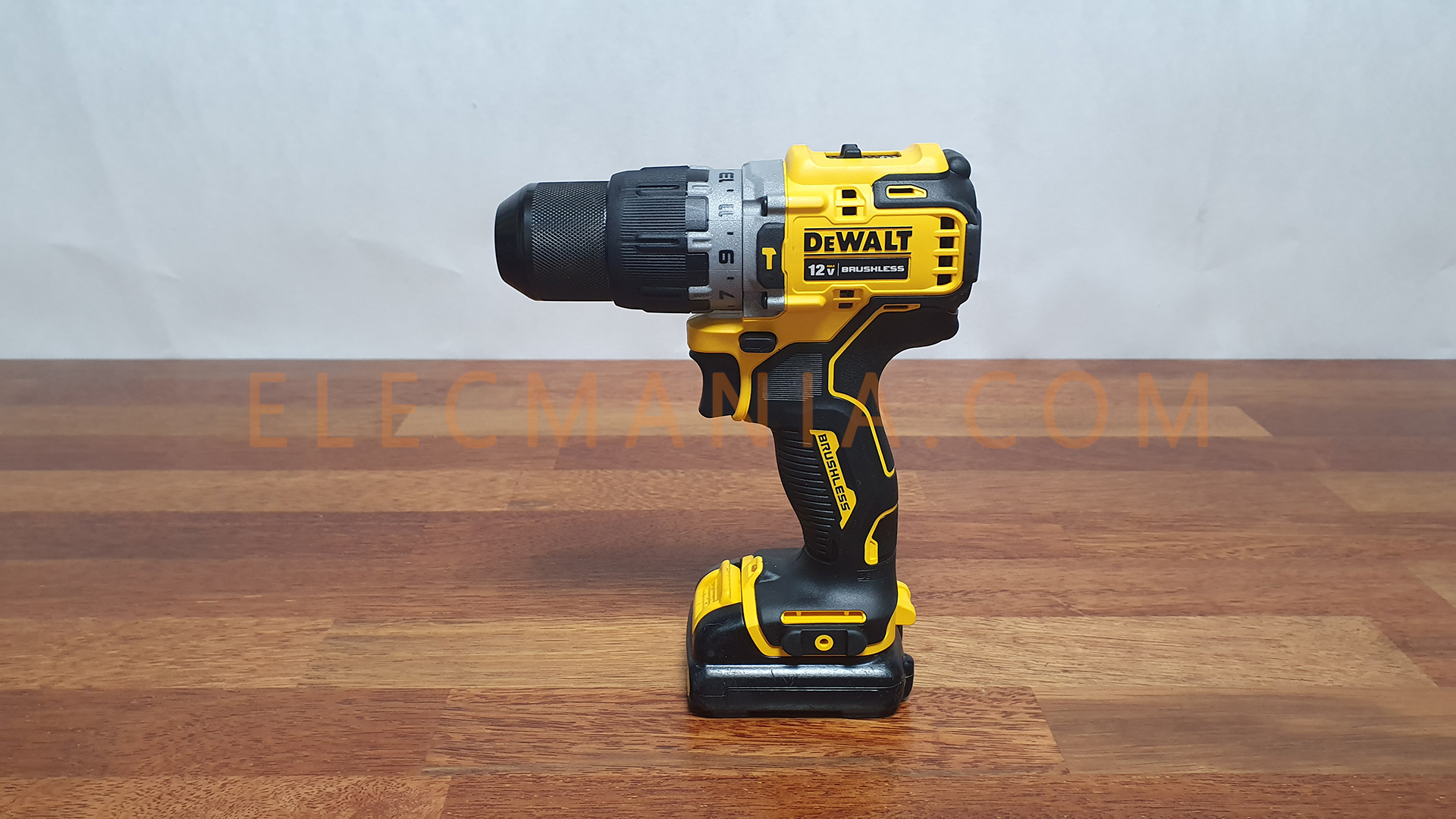 다른 측면에 보시면 제품의 간단 사양 설명이 표기되어있습니다. 브러시리스 모터가 장착되어 있으며 무부하 속도 1단 0~425 rpm, 2단 0~1500 rpm의 속도가 나오며 분당 타격수는 0~25500 bpm을 나타내고 있습니다. 또한 드릴척은 재질이 철 소재로 되어있으며 10㎜ 까지 비트를 장착할 수 있습니다. 그리고 디월트에서 사용전압 표기 방식을 변경을 하여 기존에 사용한 공칭전압(10.8V)에서 최대 전압(12V)으로 변경하여 표시를 하고 있습니다. 표기만 다를 뿐 기존의 10.8V 배터리를 그대로 사용이 가능합니다.