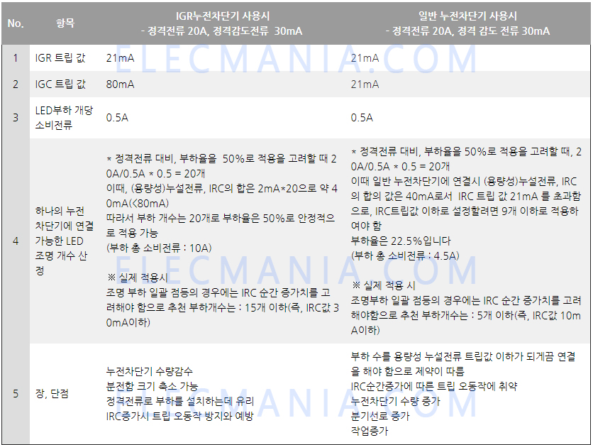 | 4 | 하나의 누전 차단기에 연결 가능한 LED 조명 개수 산정 | * 정격전류 대비, 부하율을 50%로 적용을 고려할 때 20A/0.5A * 0.5 = 20개 이때, (용량성)누설전류, IRC의 합은 2mA*20으로 약 40mA(<80mA) 따라서 부하 개수는 20개로 부하율은 50%로 안정적으로 적용 가능 (부하 총 소비전류 : 10A) ※ 실제 적용시 조명 부하 일괄 점등의 경우에는 IRC 순간 증가치를 고려해야 함으로 추천 부하개수는 : 15개 이하(즉, IRC값 30mA이하) |
