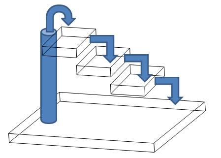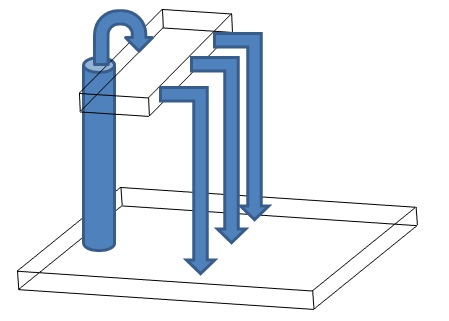 다음으로 위의 경우가 저항의 병렬 연결과 같은 경우 입니다. 위의 그림에서 물은 갈라져 흐릅니다. 이는 병렬 연결에서 각 저항을 흐르는 전류가 갈라져서 흐르는 것과 일맥 상통 합니다.