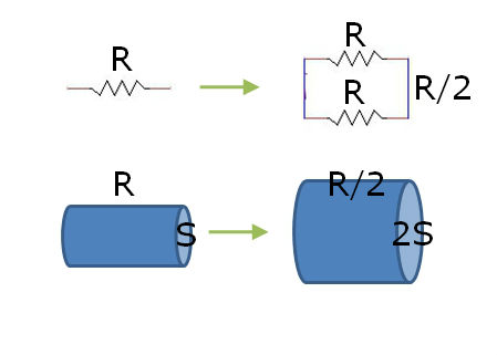 다음으로 저항을 병렬 연결하는 경우입니다. 이때 저항을 병렬로 연결하면 도선의 단면적이 넓어지는 것과 같습니다. 이때에 지난 강좌에서 저항은 저항체의 단면적에 반비례한다고 했었죠. 즉 저항 두 개가 병렬 연결이 되면 전체 저항이 감소하게 되는 것입니다.