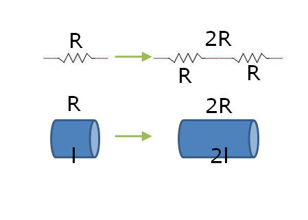 먼저 저항을 직렬 연결하는 경우입니다. 저항을 직렬로 연결하면 도선의 길이가 길어지는 것과 같습니다. 그런데 지난 강좌에서 저항은 저항체의 길이에 비례한다고 했습니다. 즉 저항 두개가 직렬 연결이 되면 전체 저항이 증가하게 되는 겁니다.