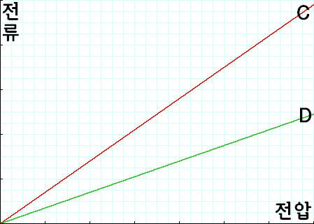 다음으로 전류-전압 그래프의 경우 입니다. 이경우에도 전압과 전류간의 관계가 비례관계로 나타 나는 데요, 그리고 위의 그래프에서 그래프의 기울기는 저항의 역수와 같습니다. 즉 C의 저항이 D의 저항보다 작다는 이야기죠.