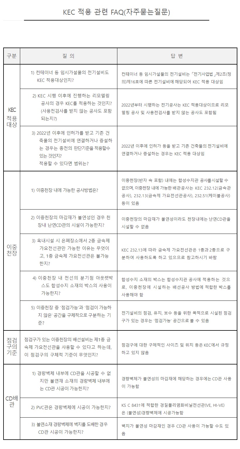 아울러, KEC적용 관련 전기안전공사의 자주하는 질의응답에 대해 아래와 같이 안내하오니 참고하시기 바랍니다.
